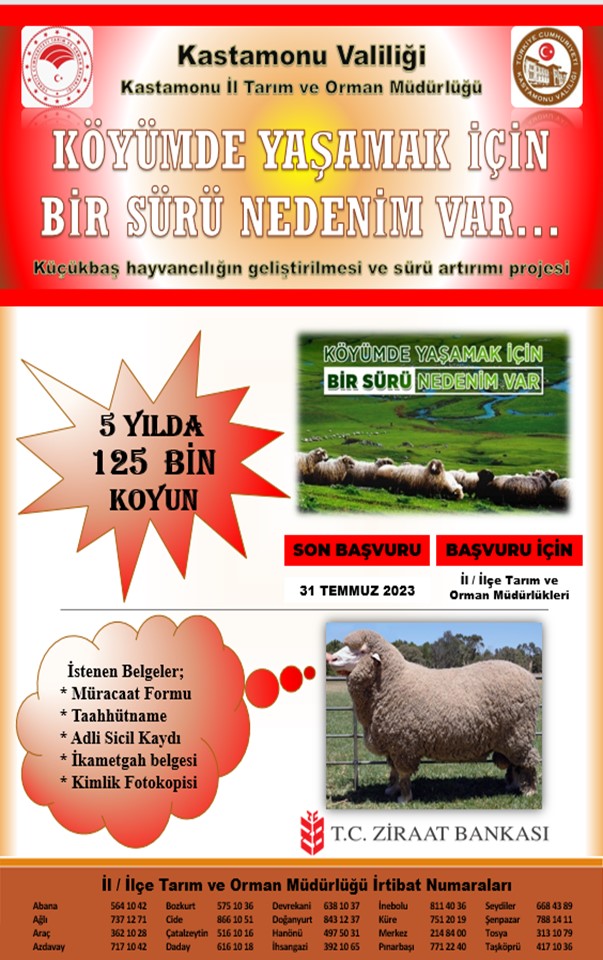 İlimizde koyun varlığının artırılması ve bu konuda faaliyet gösteren yetiştiricilerin, sürülerinin büyütülmesini amaçlayan "Köyümde Yaşamak İçin Bir Sürü Nedenim Var Projesi" Kastamonu Valiliğimiz ile T.C. Ziraat Bankası A.Ş arasında imzalanan protokol kapsamında 2. Etap başvuruları başlayacaktır. Köyümde Yaşamak İçin Bir Sürü Nedenim Var Projesine başvuru yapmak isteyen yetiştiricilerimizin, İl/İlçe Tarım ve Orman Müdürlüklerine 03.07.2023 ile 31.07.2023 tarihi arasında şahsen müracaat etmesi gerekmektedir.