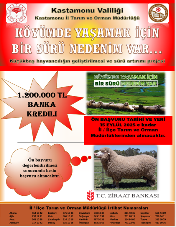 İlimizde koyun varlığının artırılması ve bu konuda faaliyet gösteren yetiştiricilerin, sürülerinin büyütülmesini amaçlayan "Köyümde Yaşamak İçin Bir Sürü Nedenim Var Projesi" Kastamonu Valiliğimiz ile T.C. Ziraat Bankası A.Ş arasında imzalanan protokol kapsamında Ön başvurular alınacaktır. İl/İlçe Tarım ve Orman Müdürlüklerine 01 Eylül- 15 Eylül 2025 tarihleri arasında müracaat edilmesi gerekmektedir.